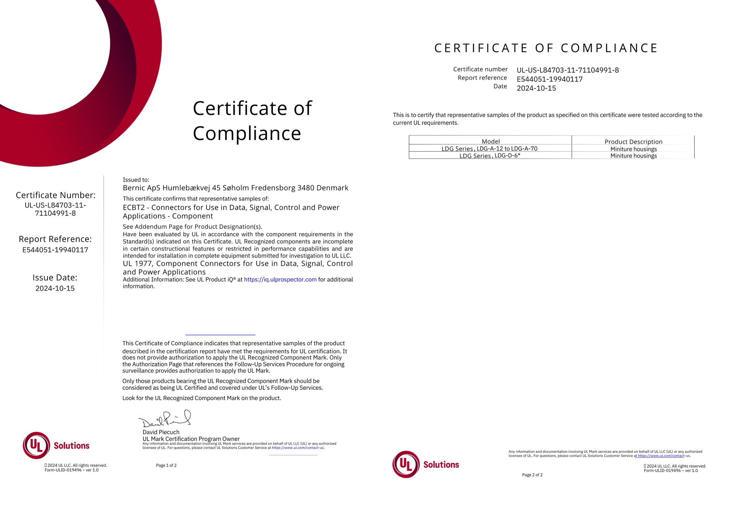 We at Bernic are proud to announce that we have obtained UL certification for several of our products.